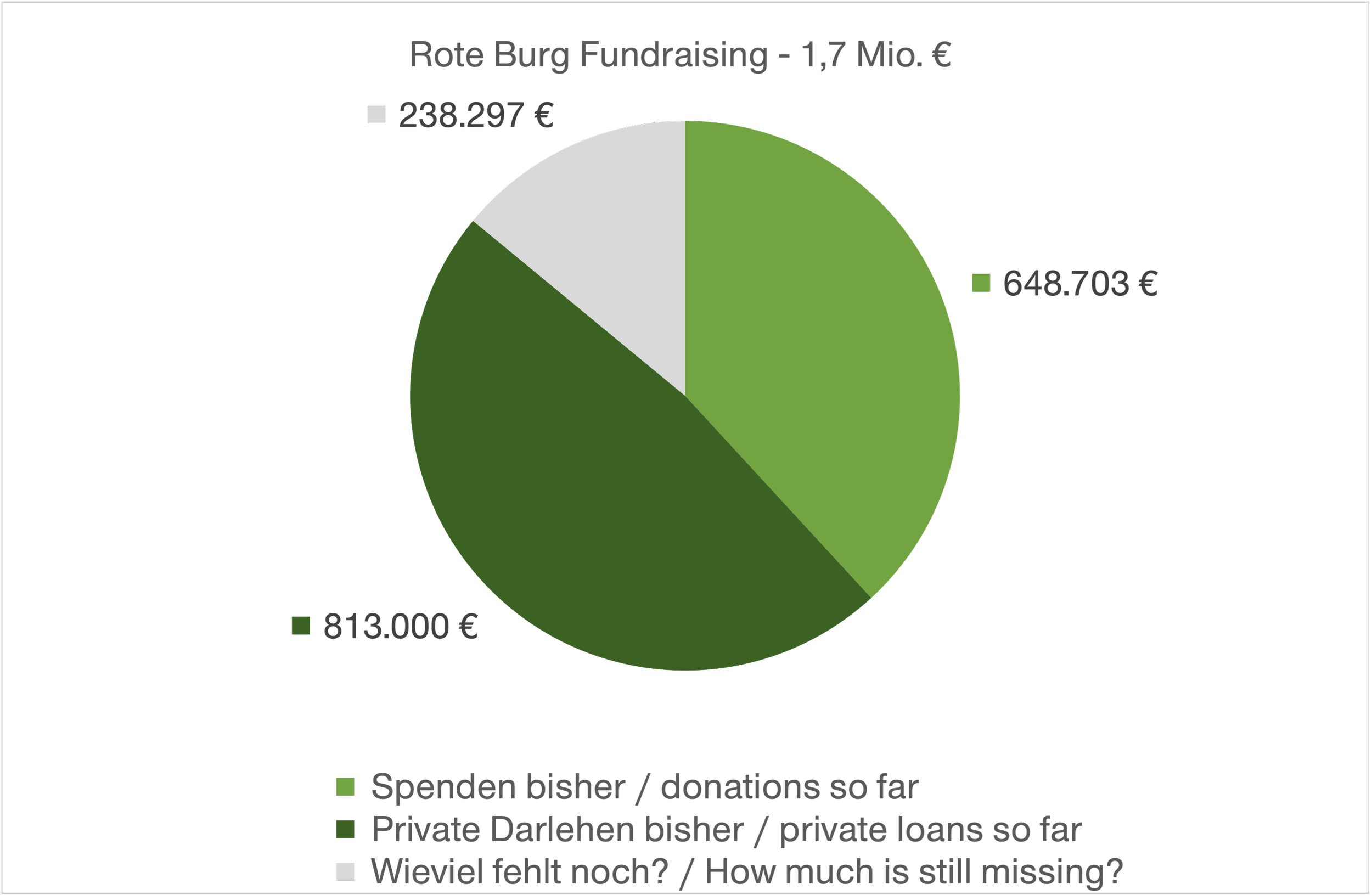 Die Gesamtkosten für das Projekts belaufen sich auf 3.1 Millionen Euro inklusive Grundstückserwerb. 1.7 Millionen Euro wollen wir an Spenden und Privatdarlehen aufbringen. Davon benötigen wir noch 238.297 €.
